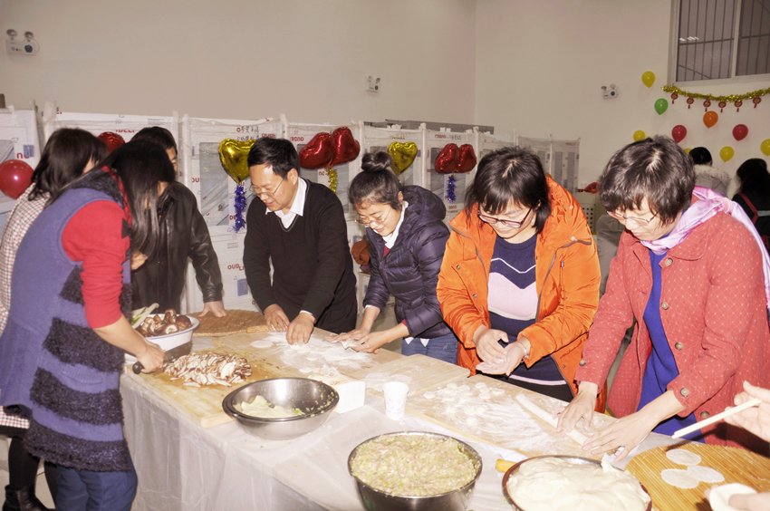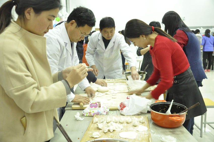 为满足老师们的不同口味,工会按照系别将老师们分为三组,大家分头准备了六种不同的馅料,器具设施一应俱全,老师们开始大显身手。为增强活动的趣味性,中间还进行了包饺子技能比赛。每组推选了两名老师作为参赛选手,以用时最短和饺子最精美作为评选指标,评出“十佳快手”和“十佳巧手”,孟昭亮书记担任评委。老师们分工有序、忙而不乱,你擀皮、我包馅,各显其能;放馅料、捏饺子皮,十指翻飞之间,一只只精巧的饺子就诞生了。指点声、欢笑声、喝彩声汇成了和谐欢乐的海洋。经孟书记评定,“十佳快手”和“十佳巧手”分别由应化队和学工环工队获得。傍晚时分,一盘盘融辛劳与快乐于一体的饺子出锅了。品尝着自己的劳动成果,老师们脸上洋溢着满足的喜悦,活动室里满着“家”的味道、“家”的温馨。