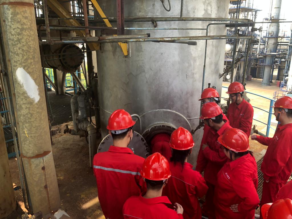在此之前,公司已委派代表为学生们进行了厂级安全教育,通过血淋淋的事故教育提醒学生们化工厂存在的危险性,让学生们了解了安全教育的重要性和国家的相关法规。之后,96名同学被分成4组,分配在常减压车间、动力车间、催化车间、化验车间跟随师傅完成实习(实训)任务。