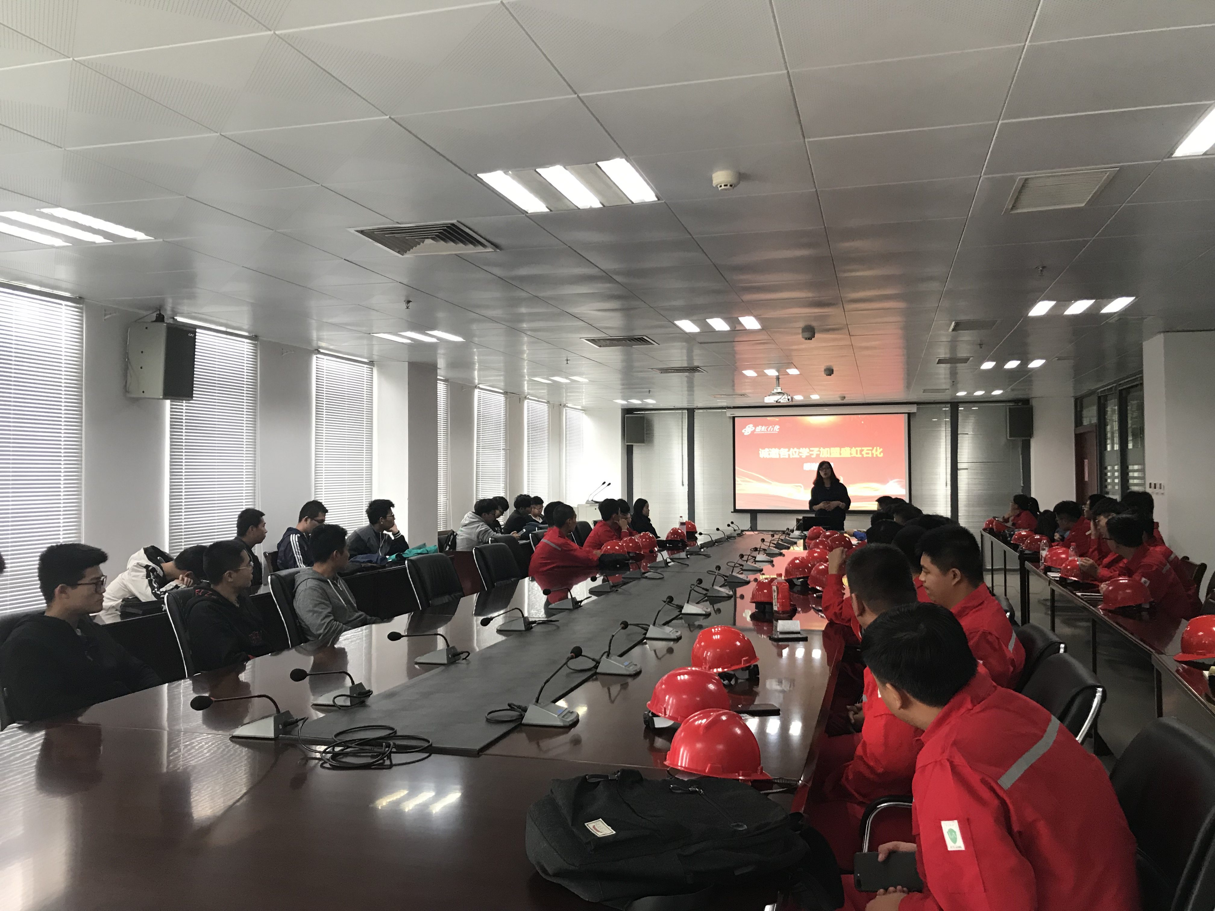 最后,人力资源部马经理在会议室详细讲解了盛虹石化集团有限公司的概况、基础设施、人文关怀、员工的晋升渠道、薪资待遇等方面。视频展示了员工宿舍、食堂等生活园区,针对大四学生就业关心问题进行了讲解,针对大二学生盛虹班的选拔问题进行了详细的回答。