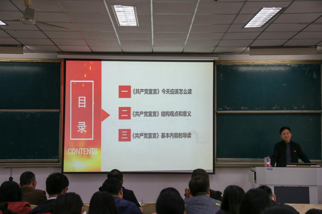 梁敬升教授从“什么是共产党?”、“共产党要干什么?”两个问题引入,结合共产党人的初心使命,追溯到共产党人的源头——《共产党宣言》。在讲授中,他围绕《共产党宣言》今天应该怎么读、结构观点和意义、基本内容导读等三个方面深入浅出地进行讲解,深刻阐述了《共产党宣言》的重大理论价值和时代意义。