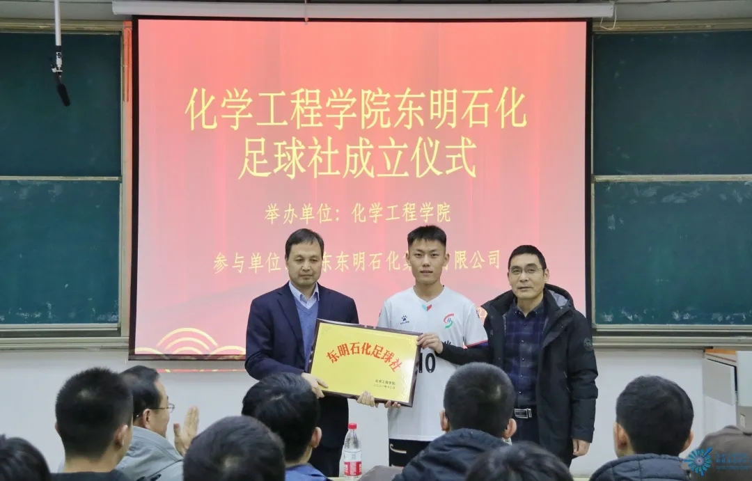 仪式由王子松主持。首先祝永胜向公司对学院学生培养的支持和赞助表示感谢,他希望学生以锻炼身体为目的,热爱运动,增强体魄,并不断了解企业的文化和发展,为将来的职业能力提供储备。之后祝书记为东明石化足球社授牌,宣布化学工程学院东明石化足球社正式成立。仪式最后,刘忠华主任表示很高兴能冠名化学工程学院的足球社,希望同学们能够积极训练,多参与比赛,通过足球运动促进身心健康发展,同时他也希望大家能更多地了解东明石化,并欢迎他们到公司实习,更希望同学们将来加入东明石化这个大家庭,共同见证公司的发展。