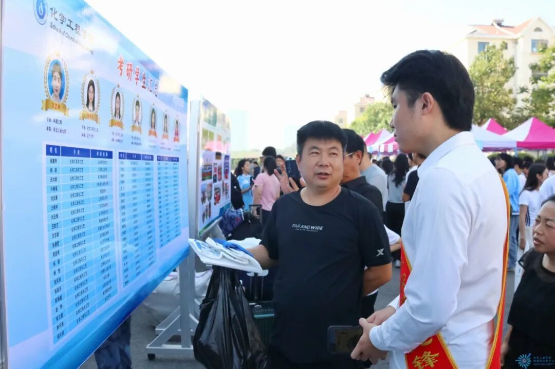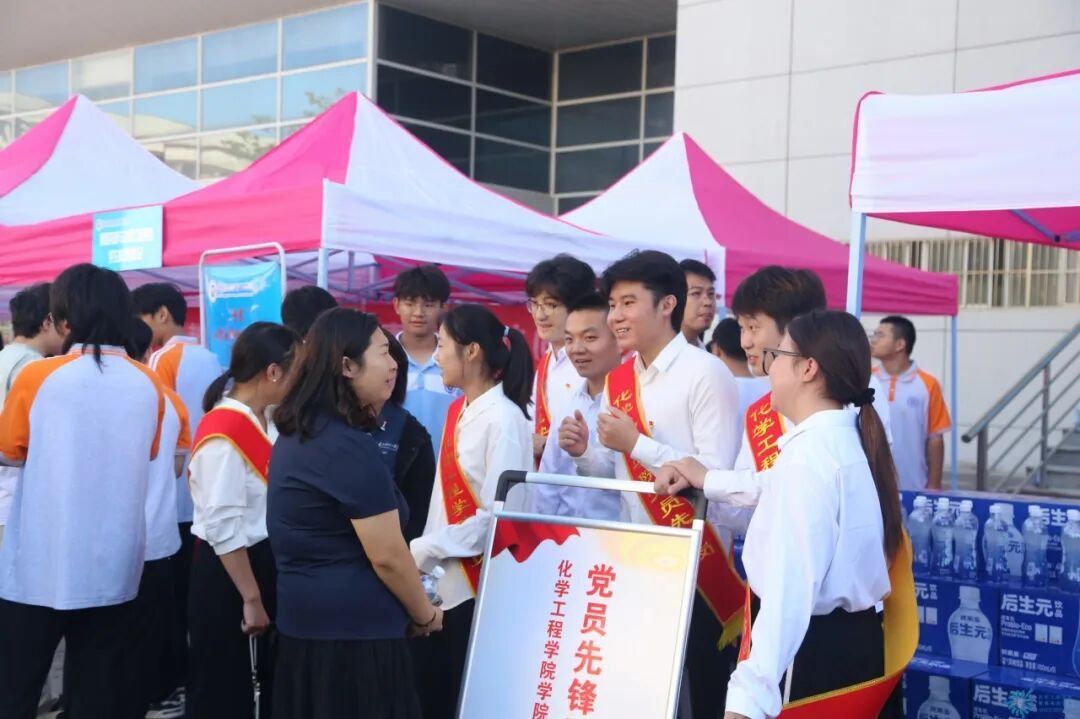 迎新现场,党员们早已整装待发,成为校园里一道亮眼的红色风景线。他们主动上前接过新生的好奇,耐心解答“报到流程怎么走”、“宿舍在哪里”、“食堂怎么付款”等疑问。面对家长们关心的“专业学习方向”、“就业前景”等问题,党员们结合专业特色,耐心、细心地介绍课程体系、科研平台与学院优势,解答家长的疑惑。党员们还详细介绍学校的校园文化、生活服务设施,更向新生们讲述化学工程学院学生党支部的初心故事与“锌征程”的服务理念。